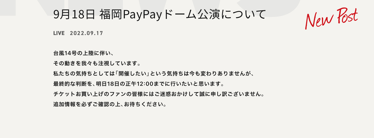 明日の福岡公演に関しましてhttps://t.co/BQuCGOx5Mz#矢沢永吉#永ちゃん#福岡PayPayドーム#台風14号#YAZAWA pic.twitter.com/2sIRdUCfiO